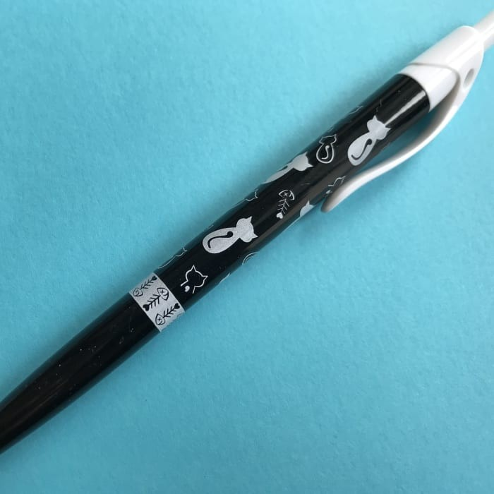 You can chose from a black pen with white cat designs or a white pen with black cat designs.