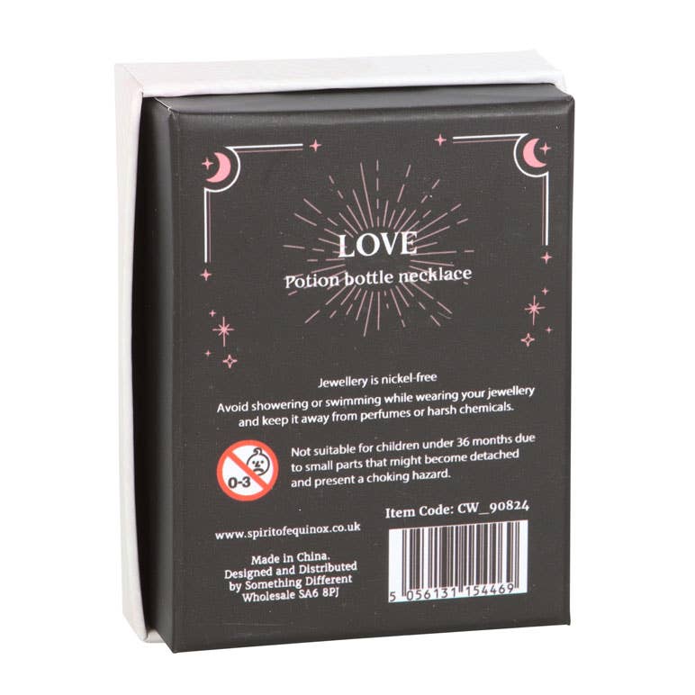 Give the gift of crystal magic with this miniature potion bottle necklace. With natural rose quartz crystal chips and a cork stopper, this necklace serves as a spellbinding accessory while attracting love, friendship and confidence. Presented in a matching gift box and perfect for that special witch in your life. Plastic bottle on a nickel-free stainless steel chain. Designed by Something