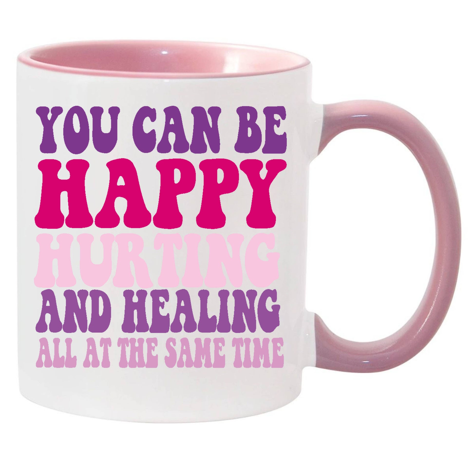 "You can be happy hurting and healing all at the same time" is the message expertly printed on both sides of this mug.