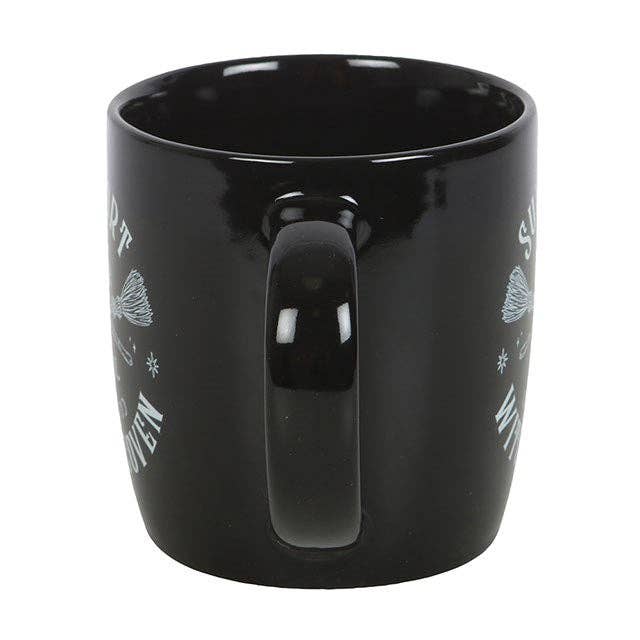 Show your support for all things magical with this black ceramic mug featuring crossed broomsticks and the phrase 'Support Your Local Witch Coven'.