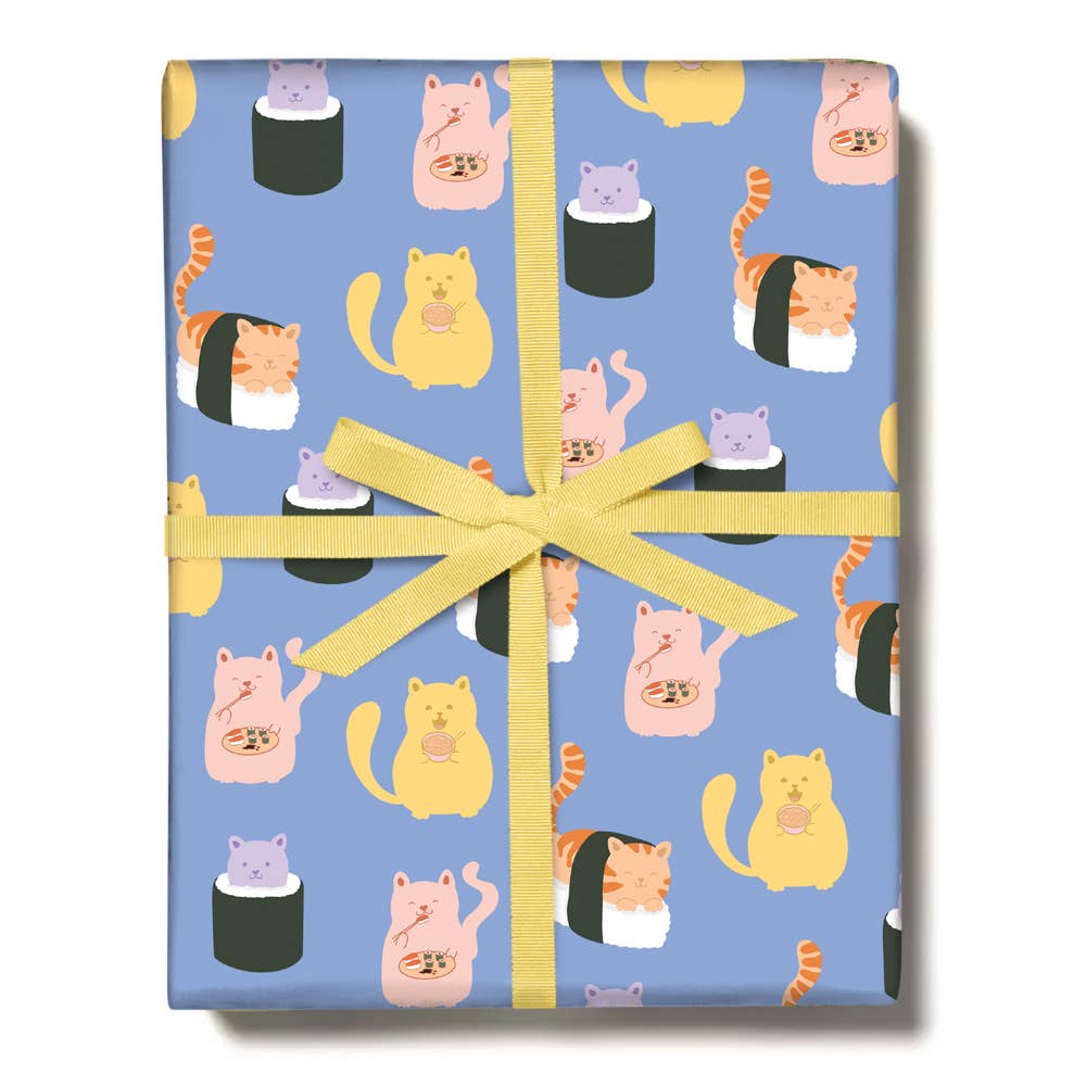 This gift wrap showcasing playful cats with a sushi theme against a blue backdrop will provide the perfect finishing touch for any cat lover's present.